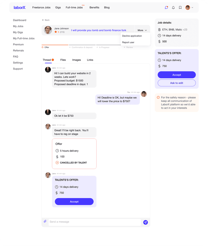 ✦ The new interface was well welcomed, yet several changes were implemented based on the results of moderated usability testing. Initially, the offer card and CTA were supposed to appear in the chat window, but 3 of 8 users said that they actively communicate with freelancers and the buttons may get lost in the correspondence.