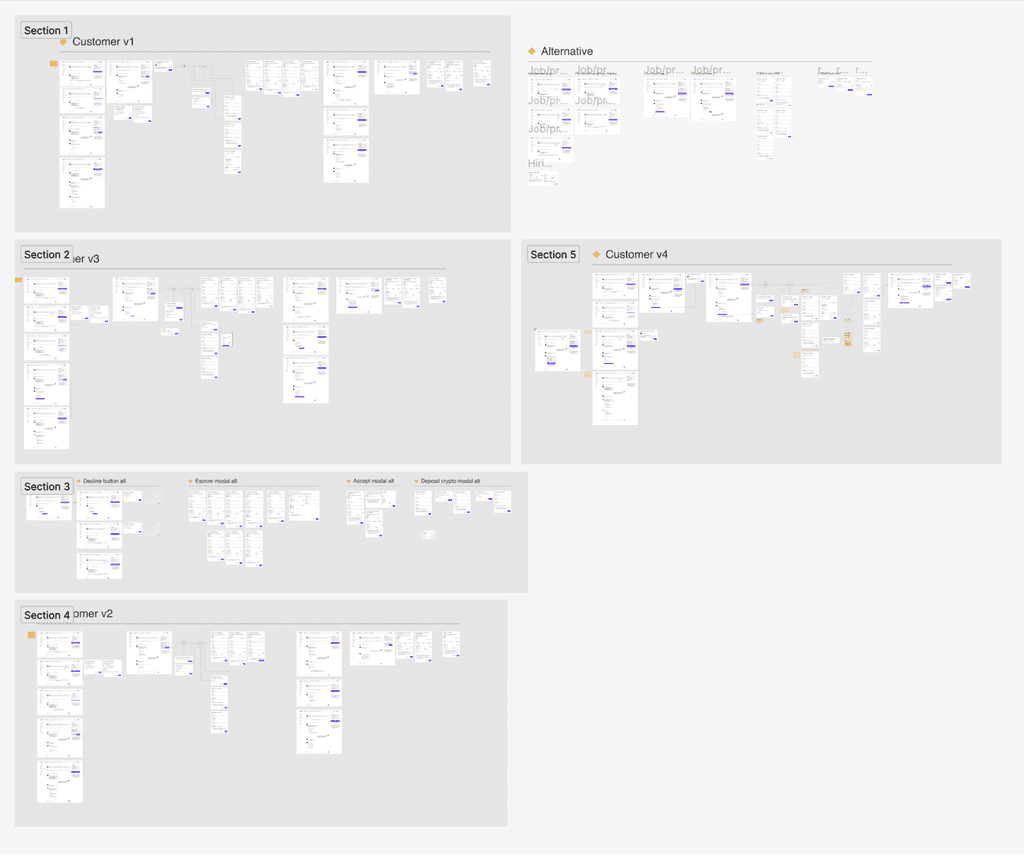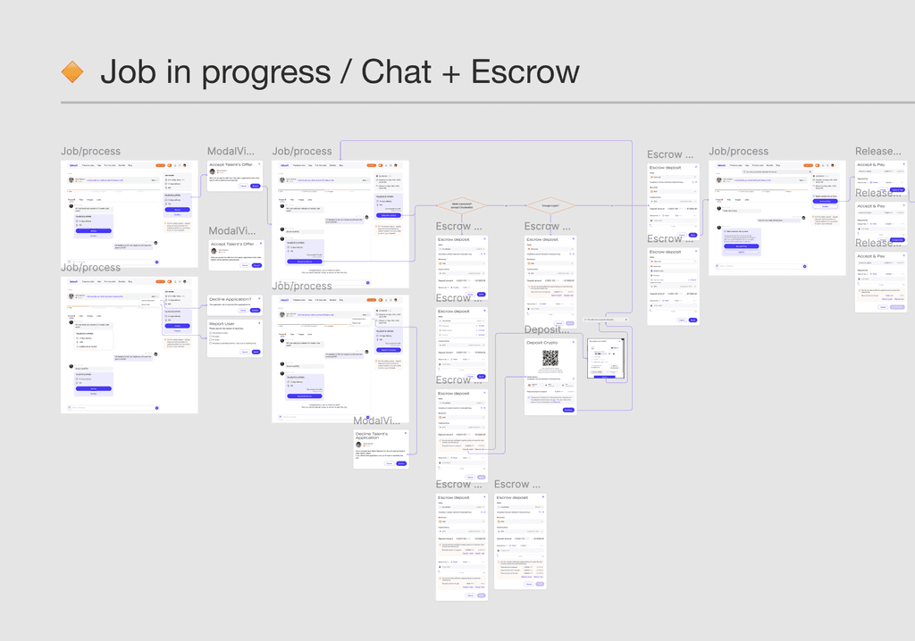 2. Competitive analysis and references. Along with identifying the pain points of users and possible solutions with which we will work in this section, I analyzed the flow of work with orders from the main competitors, the Upwork and Fiverr platforms, as well as other products that have similar functionality (for example: an online transaction between private seller and buyer, ordering offline services from a private contractor with communication and payment on the platform). Moreover, I analyzed crypto wallets and crypto exchanges for future redesign of escrow deposit flow.